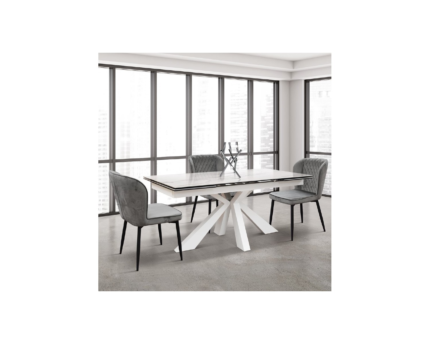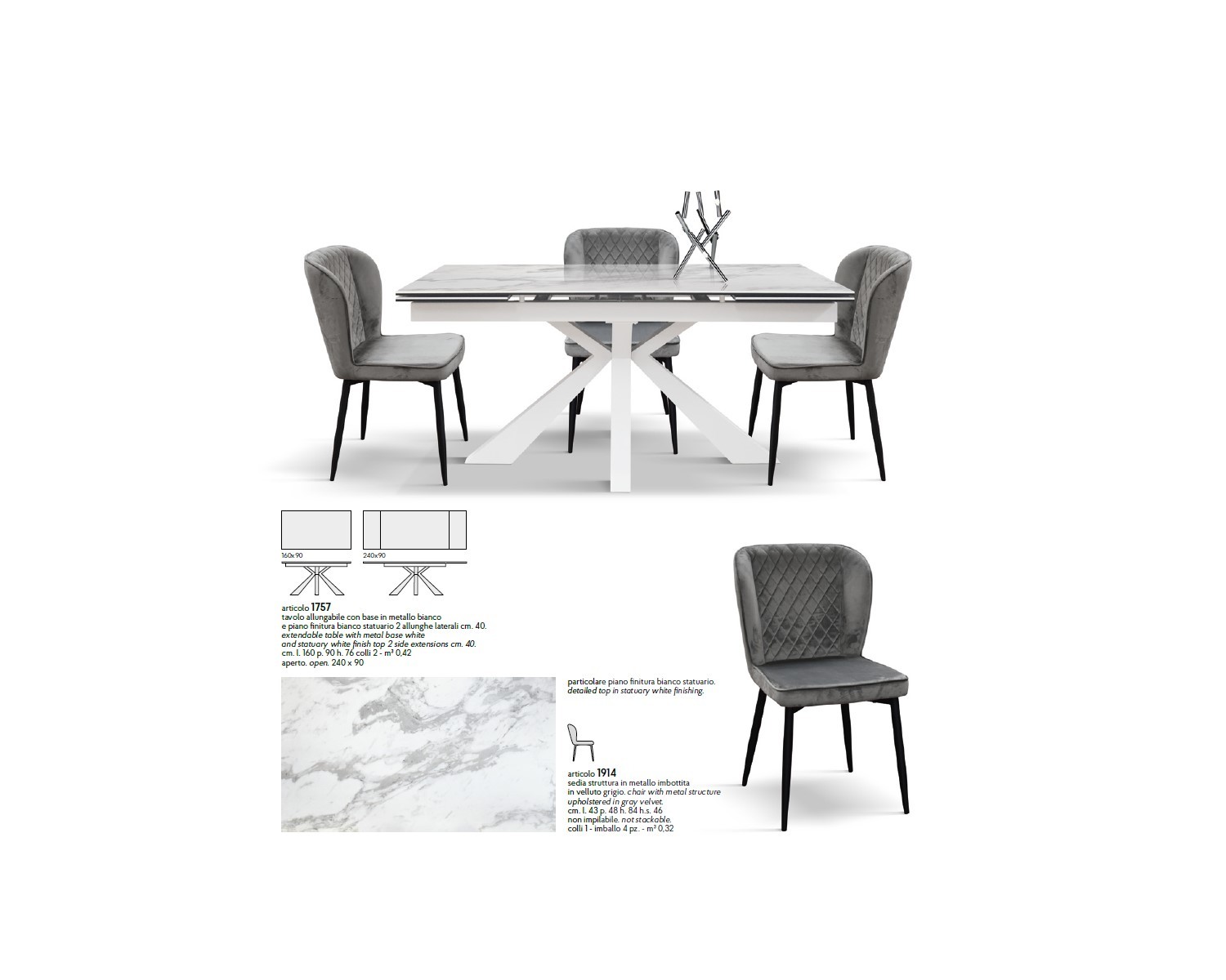 Tavolo allungabile 160x90 con 2 all. cm. 40 base metallo bianco e piano finitura bianco statuario
