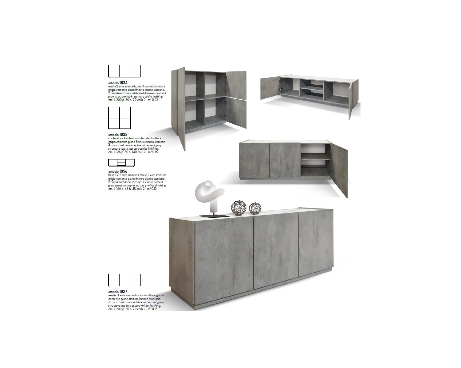CREDENZA MADIA 3 ante ammortizzate 200x50 struttura grigio cemento e piano finitura bianco statuario