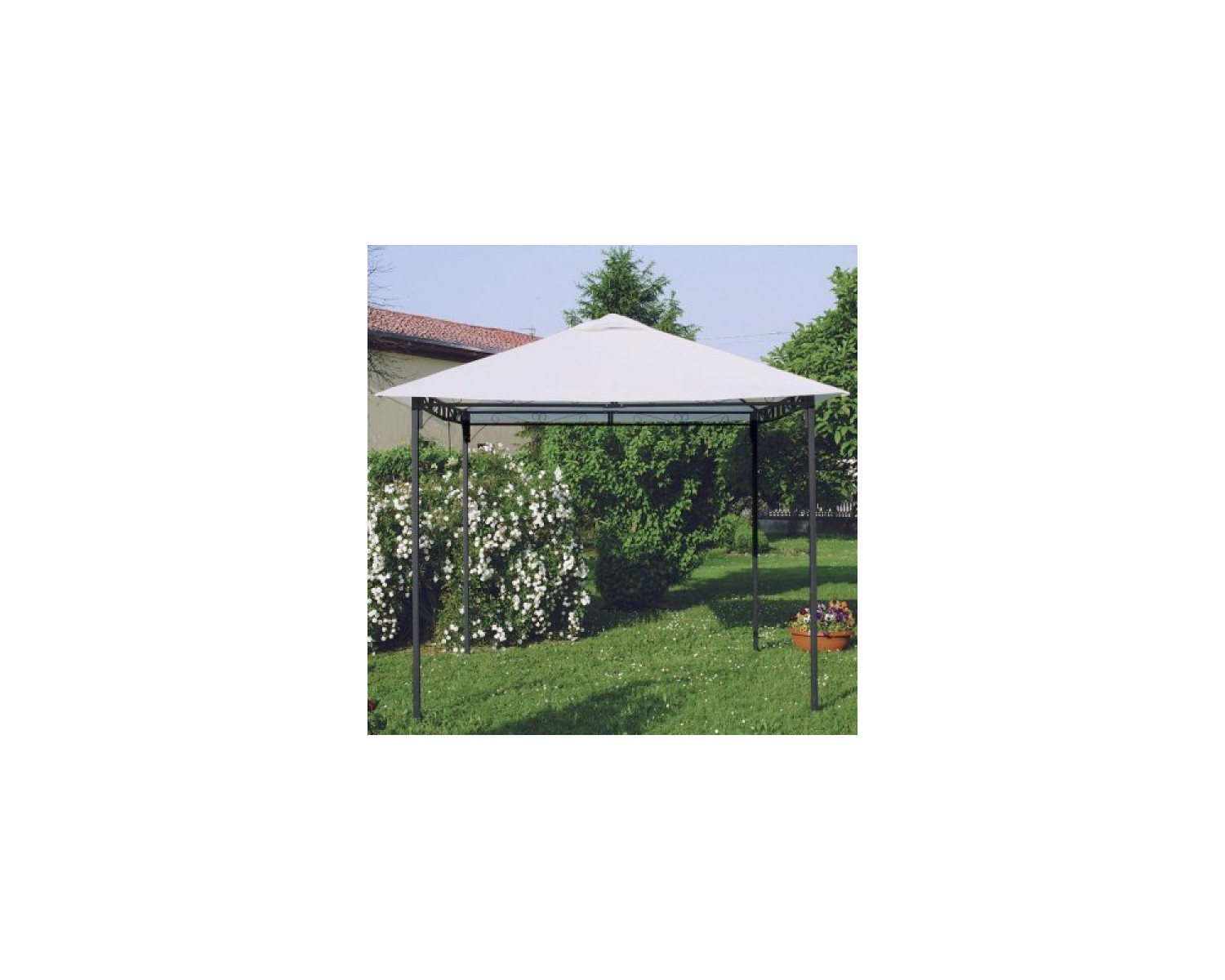 Gazebo con struttura in metallo verniciato completo di telo di copertura in poliestere da 180 gr/mq. Palo da 40x40 mm. Struttura colore antracite, telo naturale. Dimensione: 3x3 m - H. 2.05/2.50 m. Confezione scatola di cartone con istruzioni di assemblaggio. Disponibile telo di ricambio (cod. 786/20).