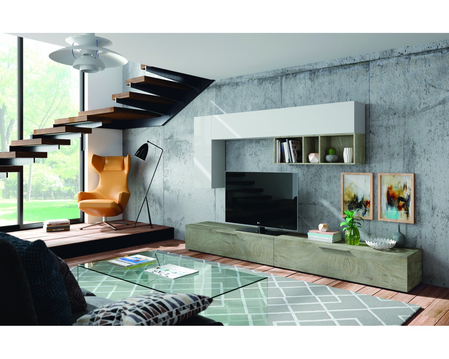 PARETE ATTREZZATA BIANCO E CEMENTO