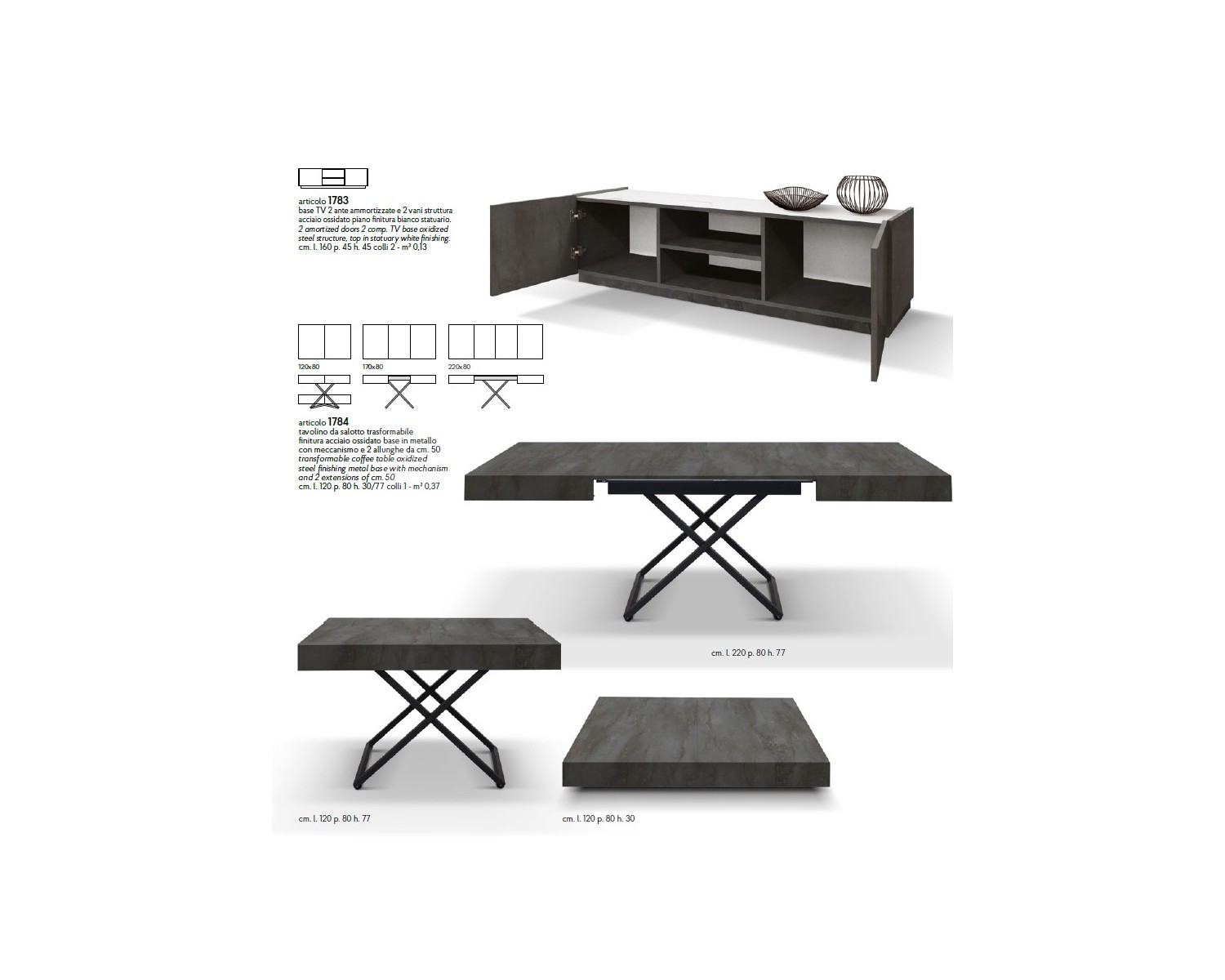 Tavolino trasformabile 120x80 con 2 all. cm. 50 struttura metallo e piano finitura acciaio ossidato