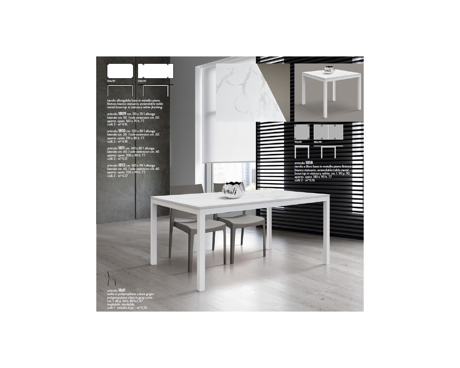 Tavolo allungabile 120x80 con 1 all. cm. 50 base metallo piano finitura bianco statuario