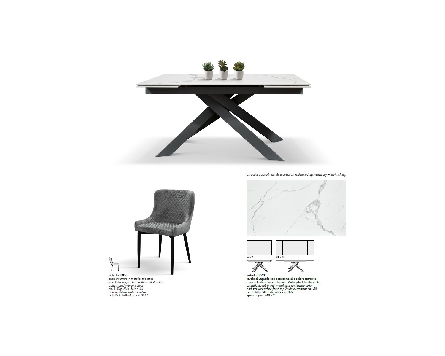 Tavolo allungabile 160x90 con 2 all. cm. 40 base metallo antracite e piano finitura bianco statutario