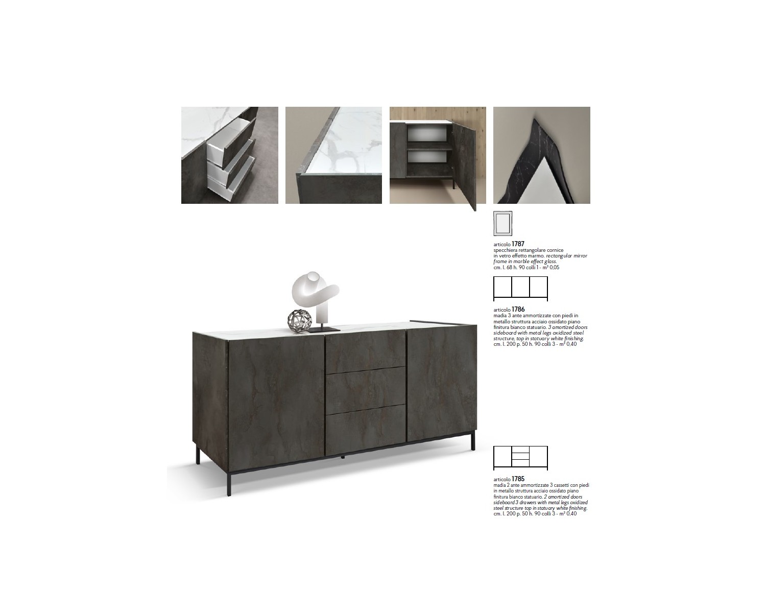 Madia 3 ante ammortizzate 200x50 con piedi in metallo struttura acciaio ossidato e piano finitura bianco statuario