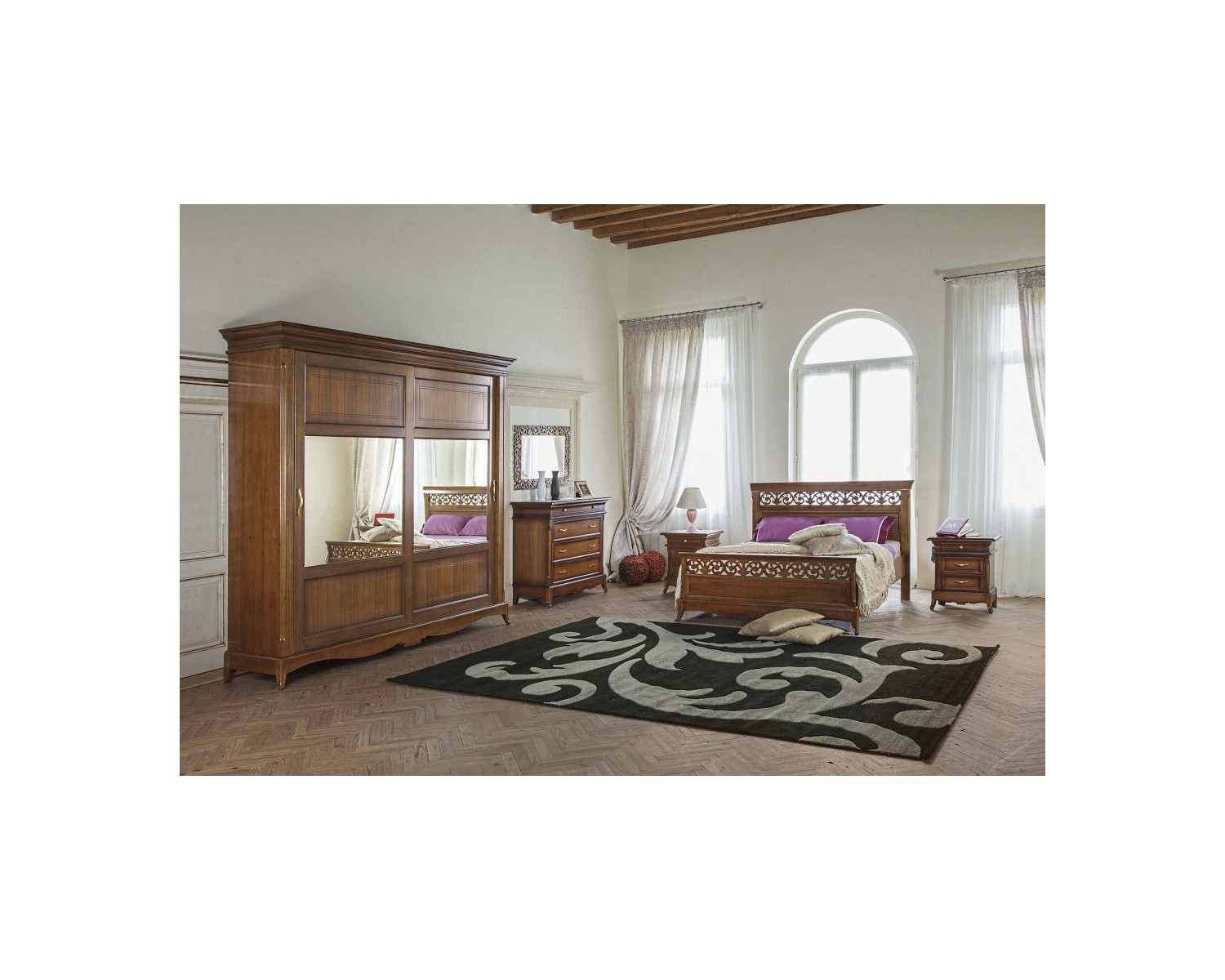 CAMERA COMPLETA LEGNO MASSELLO CON INTAGLIO ARMADIO ANTE SCORREVOLI LETTO COMO E COMODINI