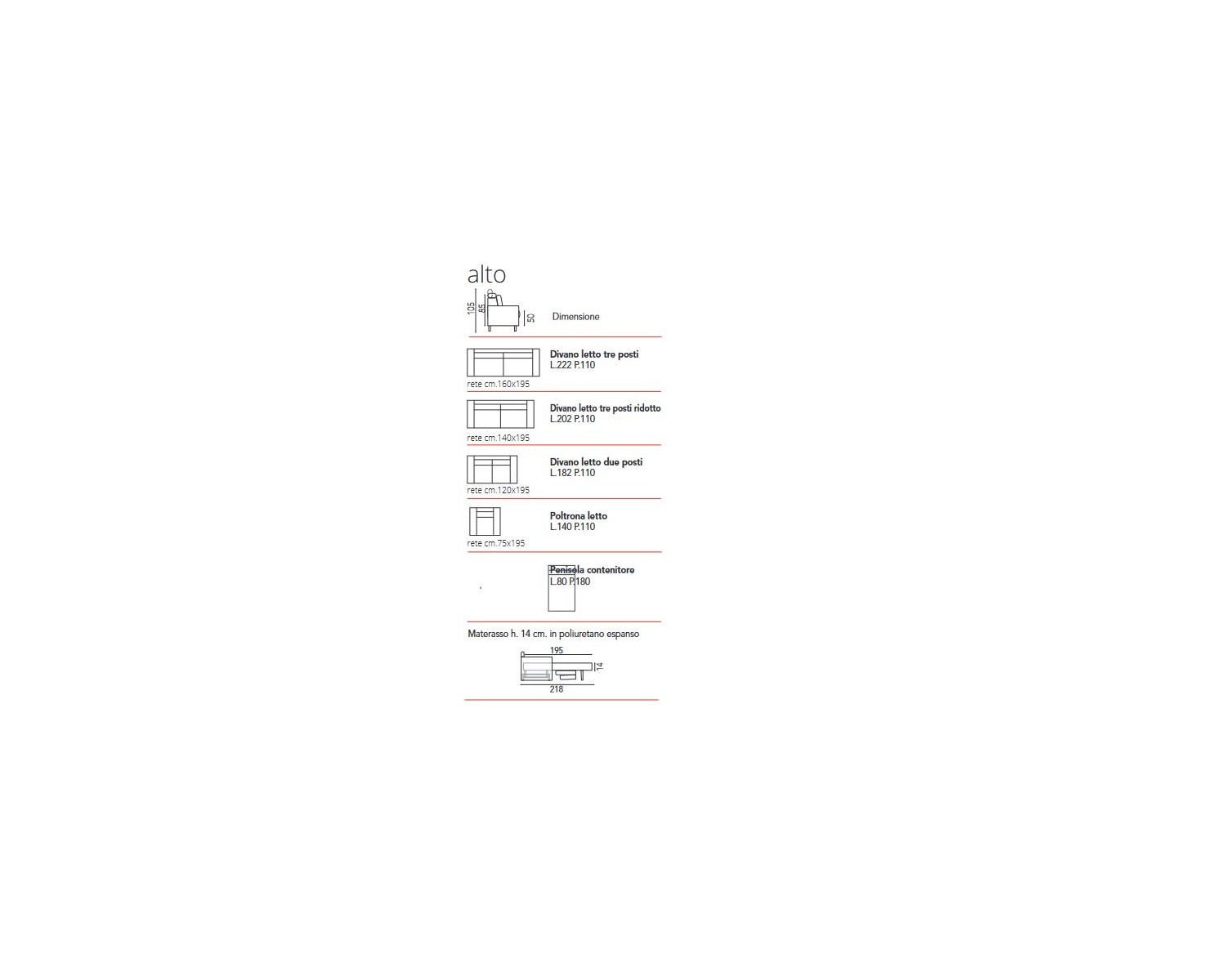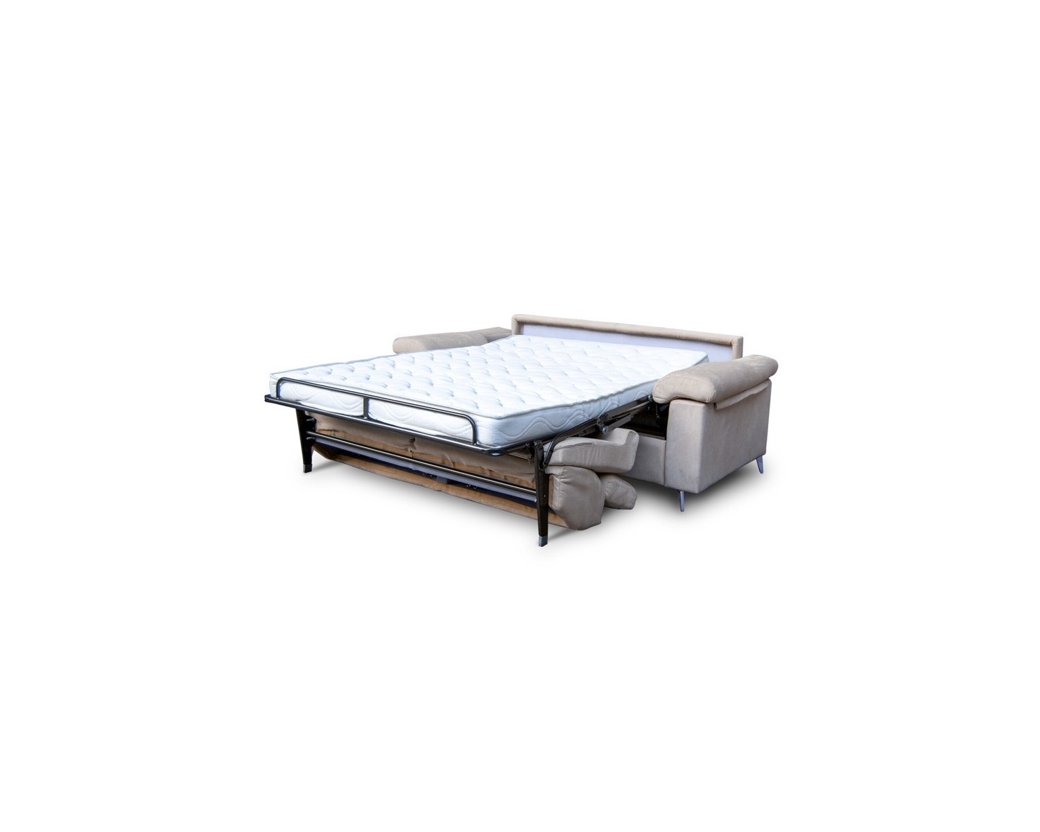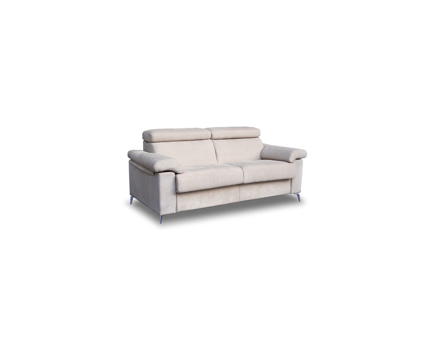 Divano letto con poggiatesta reclinabili e piede alto. Materasso 195 cm.Interno in poliuretano espanso h. 14 cm., rivestito in tessuto trapuntato, comodo e di grandi dimensioni. Meccanismo:Apertura agevolata con rete elettrosaldata.Struttura in acciaio, alta resistenza e durata, verniciato a forno.