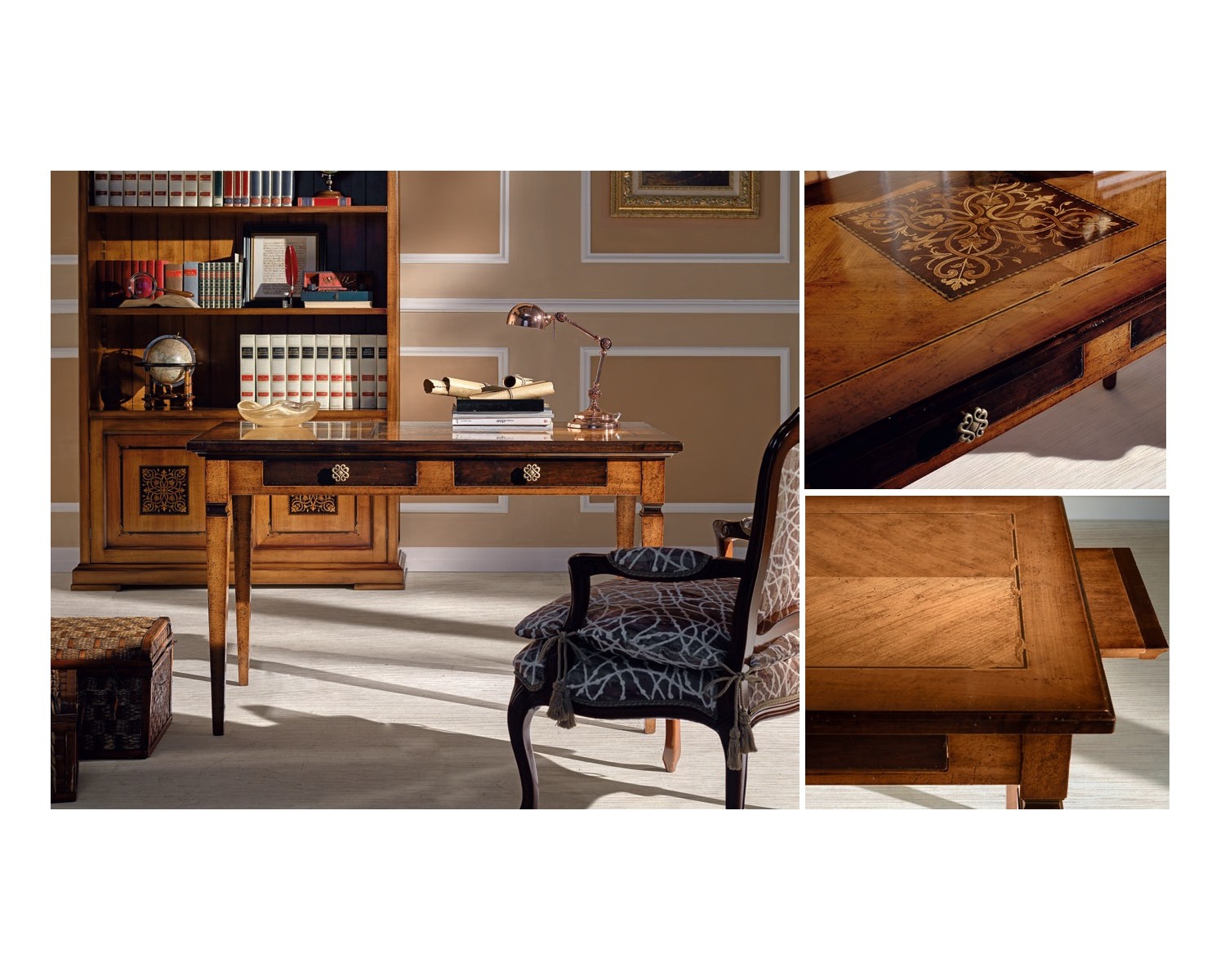 scrittoio legno intarsio 2 cassetti e tirelli l 129 p 69 h 78